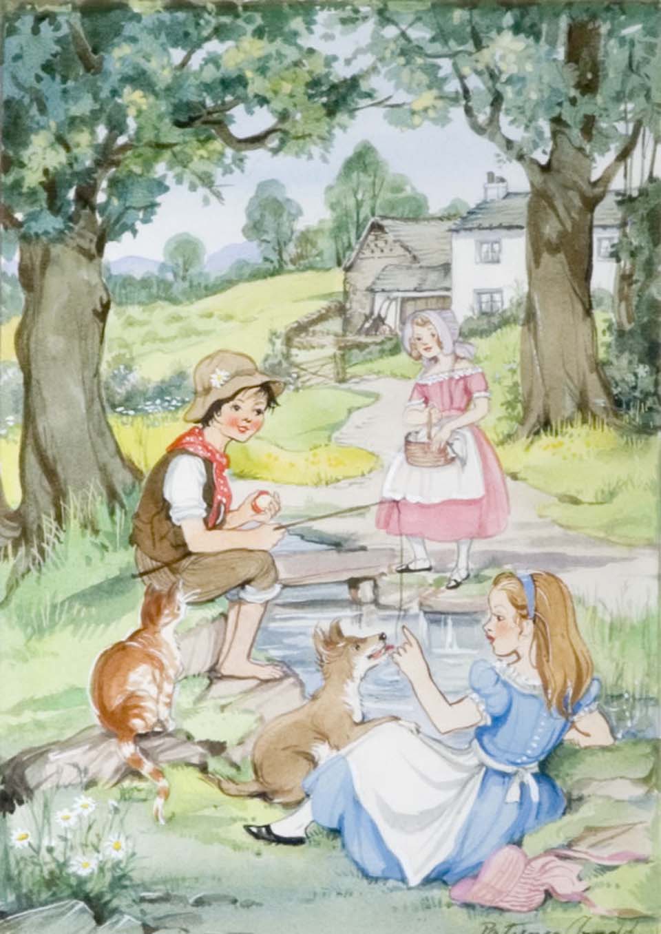 La prolifique artiste et illustratrice britannique Patience Arnold (1901-1991) était surtout connue pour ses peintures sur le thème de l'enfance. Elle produisait fréquemment des œuvres mettant en scène des contes de fées et des comptines, et illustrait de nombreux livres pour enfants sur ces thèmes. Cette grande aquarelle est typique de son travail. Dans "Nursery tales" elle présente un montage de scènes tirées de huit comptines traditionnelles britanniques : « Here We Come Gathering Nuts in May », « Ring-a Ring-a Roses », « Oranges and Lemons », « Curly Locks », « Lavender's Blue », « Here We Go Round the Mulberry Bush », « Mary, Mary Quite Contrary » et « I Had a Little Nut Tree ». Elle est magnifiquement peinte ; les enfants ont des visages charmants et il y a beaucoup de détails complexes. La signature d'Arnold se trouve dans le coin inférieur droit. Le tableau date des années 1960 environ.